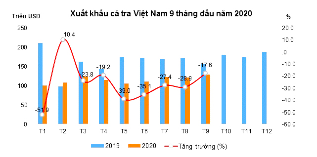 Tính đến hết tháng 9/2020, tổng giá trị XK cá tra đạt 1 tỷ USD, giảm 28,6% so với cùng kỳ năm trước. Riêng tháng 9/2020, giá trị XK đạt 129 triệu USD, giảm 17,6% so với cùng kỳ năm 2019
