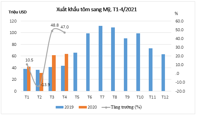 Bốn tháng đầu năm nay, nhất là kể từ tháng 3/2021, giá trị XK tôm sang thị trường Mỹ tăng trưởng mạnh, từ 47-48% so với cùng kỳ năm 2020. Vốn là 1 trong 2 thị trường XK tôm hàng đầu của Việt Nam nên Mỹ luôn thu hút đông đảo DN tham gia xuất sang thị trường này. Quý 1/2021, có trên 60 doanh nghiệp tôm XK sang Mỹ, trong đó, 10 công ty lớn đã chiếm tới 75% tổng kim ngạch XK tôm của cả nước. Có giá trị XK lớn nhất là Công ty CP Thủy sản Sóc Trăng (STAPIMEX). Ngoài ra còn một số doanh nghiệp lớn khác như: Út Xi, Thông Thuận, Minh Phú Hậu Giang.
