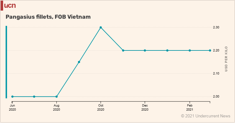 Giá cá tra nhập khẩu vào Mỹ đã tăng khoảng 6-7% kể từ cuối tháng 2. Ông cho biết, cuối tháng 3/2021, giá cá tra nguyên liệu trong nước và giá xuất khẩu đã phản ánh điều đó; giá cá tra phile từ khoảng 1,60 - 165/pound vào cuối tháng 2 lên 1,70 -1,75/lb hiện nay.