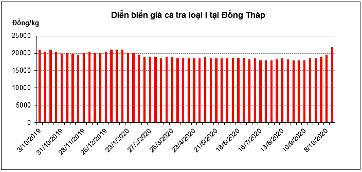 Tới cuối tháng 10/2020, giá cá tra loại 0,7- 0,8 kg/con tại Đồng Tháp đã tăng lên mức 21.800 – 22.500 đồng/kg, tăng từ 500 – 700 đồng/kg so với tuần trước, giá cá tra bột cỡ 28 – 35 con/kg và 50 – 60 con/kg cũng tăng lên mức từ 22.000 – 24.000 đồng/kg, tăng 1.000 – 1.500 đồng/kg so với giữa tháng 10.