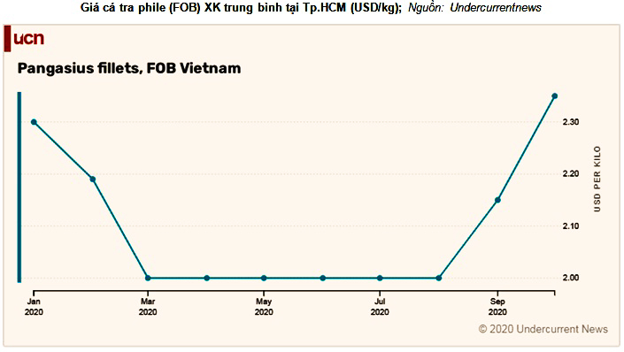 Sau khi giá cá tra XK trung bình giảm xuống mức 2,15 – 2,25 USD (tháng 10-12/2019) từ giá tốt 2,75 USD vào tháng 3/2019. Giá cá tra phile đông lạnh XK đã tăng lên mức 2,25 – 2,35 USD/kg trong tháng 1/2020. Tuy nhiên, trong tháng 2 và 3/2020, giá cá tra phile đông lạnh XK lại giảm xuống mức dưới 2,2 USD/kg và mức giá này tiếp tục được duy trì cho tới hết Q2/2020. Bước sang quý 3/2020, giá cá tra phile đông lạnh XK đã tăng lên mức từ 2,35- 2,5 USD/kg. Tới cuối tháng 10/2020, giá cá tra phile đông lạnh XK trung bình cũng đã tăng lên mức 2,65 – 2,7 USD/kg.